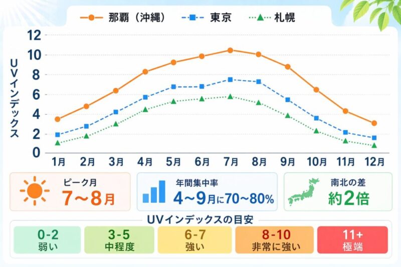 2. ピークは6〜8月 この3ヶ月間だけで、年間紫外線量の**約70〜80%**が降り注ぎます。